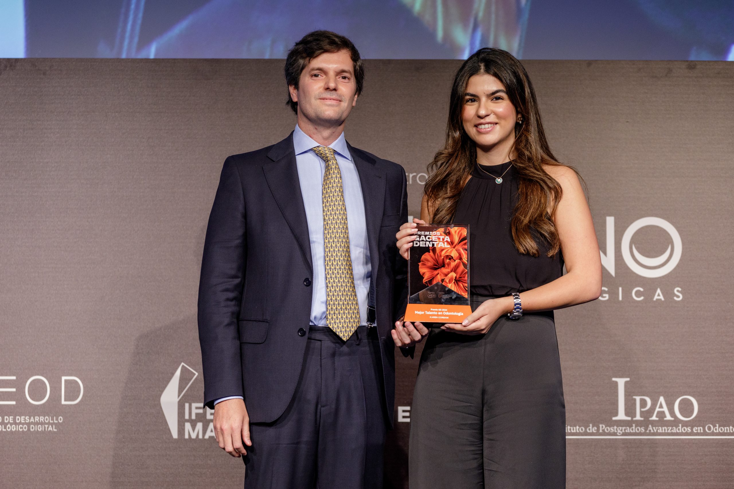 Manuel (Director de IPAO) haciendo entrega del premio GD al “Mejor Talento en Odontología en la 27 edición de los premios Gaceta Dental”